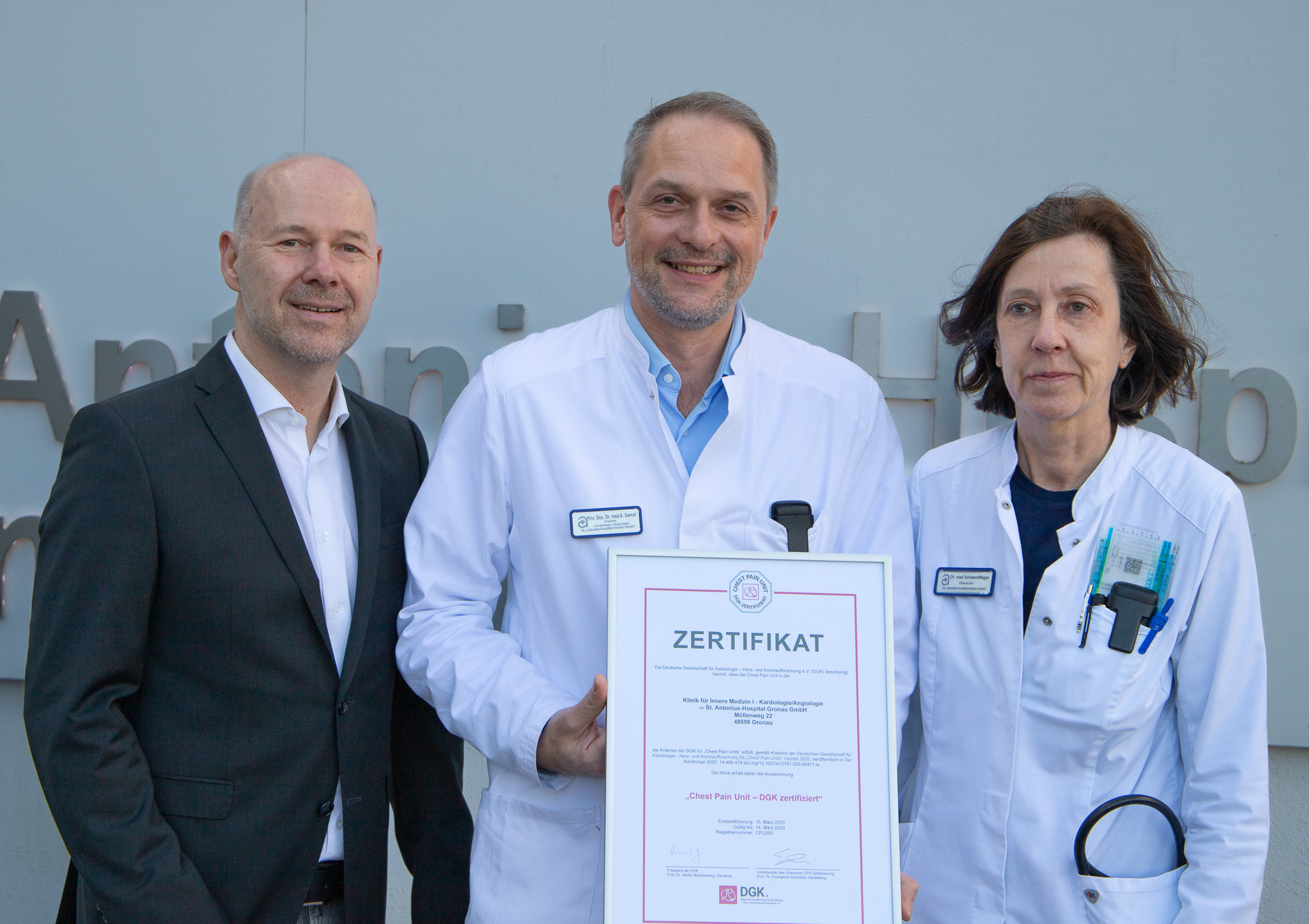 ... weiterlesenGronau, 9. April 2026. Die Klinik für Kardiologie und Angiologie hat die Rezertifizierung ihrer Chest Pain Unit (CPU) durch die Deutsche Gesellschaft für Kardiologie (DGK) erhalten. Damit erfüllt das Brustschmerz-Zentrum weiterhin die hohen Qualitätsanforderungen der Fachgesellschaft und bleibt bis 2029 als …